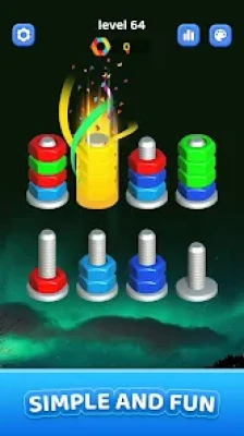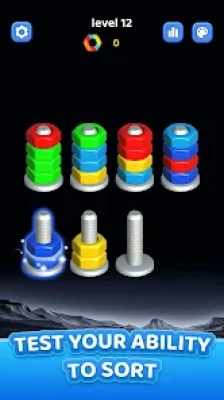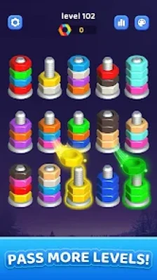 In this creative game, you will enter a world where nuts and studs are intertwined. When nuts of different colors are randomly stacked, your goal is to use strategy to correctly sort them onto the corresponding studs. Every time you sort successfully, you will get rewards and unlock more difficult levels!