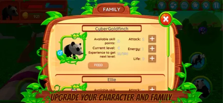There is an opportunity to improve the individual characteristics of family members and characteristics that affect all pandas in the family at once. Do not forget to improve the characters! Get experience doing tasks and eating bamboo. After receiving a level, the character can spend it on points of attack, energy or life. There are also special skills that allow you to increase speed, collect more food, get more resources for actions in the game, etc.