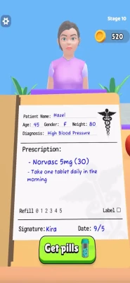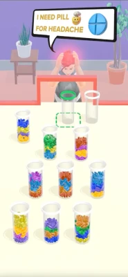 Pills Sort is a game that challenges players' quick thinking and coordination skills. The objective of the game is to correctly sort and match various colored pills as they fall from the top of the screen into their corresponding containers at the bottom. Remember you need to get the pills as per the prescription and then label them as well . Players must swipe left or right to move the pills, guiding them to the appropriate containers with matching colors.