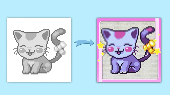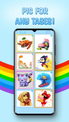 👉 A plethora of stunning pixel art images: Color-by-number cartoons, vehicles, pets, etc., ranging from easy-to-color to highly detailed pixel art templates.