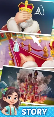Mystery & Investigation: The story revolves around two central mysteries: identifying the arsonist responsible for the fire and locating the missing King. Clues are uncovered progressively as you complete merging tasks.