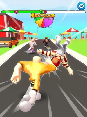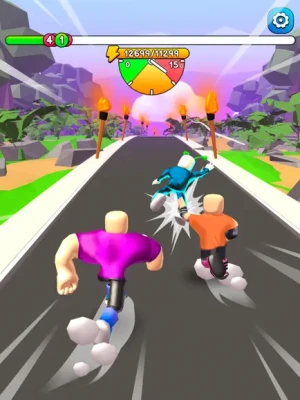 As you race, you'll need to use quick reactions to navigate tight turns and avoid obstacles, as well as strategically use your speed to stay ahead of your opponents. During the race, your opponents will fight you and try to knock you out of the race. Don't be afraid to collide with other racers, upgrade your strength to gain an advantage and increase your chances of winning.