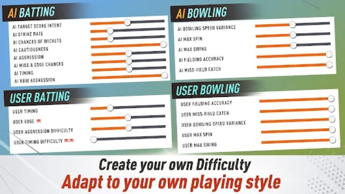 Introducing Custom Difficulty! For the first time in a mobile cricket game, you can shape AI to match your own unique play style. With over 20 adjustable gameplay elements, you can fine tune the AI’s batting and bowling strategies, from strike rate and aggression to bowling speed, spin, and even fielding accuracy. Whether you want a fierce challenge or a relaxed match, customize your AI’s behaviour and enjoy a unique cricket experience every time you play!
