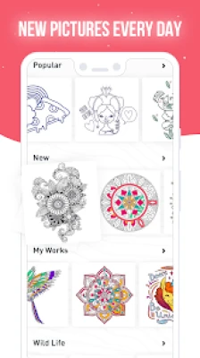 - Amazing choice of wonderful drawing pages: Mandalas, Patterns, Masks, Sea Creatures, Animals, Birds, Flowers, Places, Food — lots of pictures to explore;
