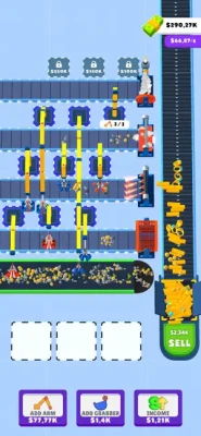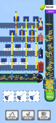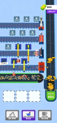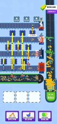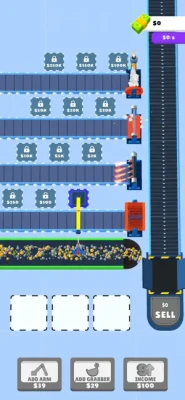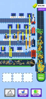 Merge Robo-Cranes and produce new items. Start produce by adding arm and cranes, Improve them by merging, Produce new items.