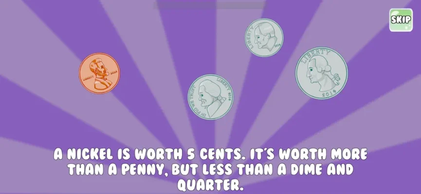 * learn the visually appearance of pennies, nickels, dimes, and quarters.