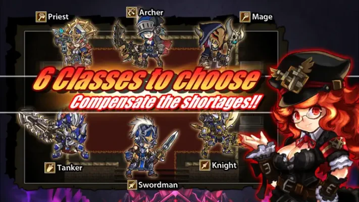 Enjoy 16-bit styled SLG with stunning visuals and animation! 6 classes to choose: Swordman, Priest, Knight, Mage, Archer and Tanker. Compensate the shortages with your own formation. Acquire and customize your team with over 400 arms and 50 skills.