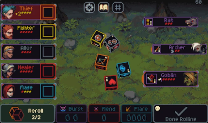 Take control of 5 heroes, each with their own dice. Fight your way through 20 levels of monsters and try to take on the final boss. If you lose a single fight you have to start over so be careful (and lucky!).