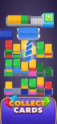 Fill the target tray with 10 cards of the same color to clear it and reveal a new target. The full tray leaves the screen from the right side, and a new one comes from the left side.