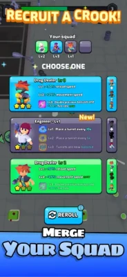 Assemble Your Squad: Recruit up to 4 crooks, each with unique abilities, and level up by merging them.