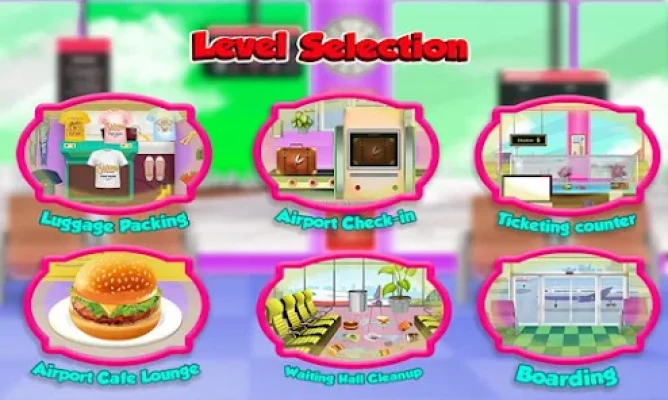 It is time to take over this fun city airport! Build your own airline, managing all the aircraft and crew. Your airport must be the best one! Fun Plane simulation games for girls is amazing! Security check the travelers luggage through scanner carefully and remove prohibited items in Summer Vacation Airport Trip. Manage cleanliness in the waiting hall for VIP passengers. Pick up the garbage from the airport floor & put in dust bin. Check passports on the ticketing cashier counter, take money in cash currency, put in the cash register machine & issue tickets after complete boarding entry. Cook delicious foods including burgers & sandwiches in the airport kitchen lounge for guests.