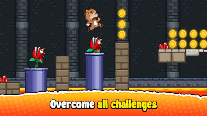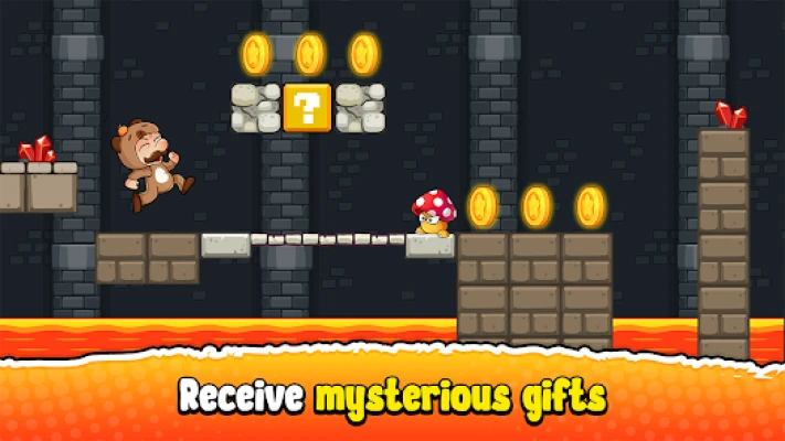 In this classic adventure jungle game, you can add useful items in your bag, for example, invincible star, toolbox, extra life, shamrock and checkpoint. Once you are in the adventurous world, tap the bag to use these items. The items are limited so use them wisely.