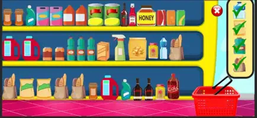 This shopping game includes a cash register, grocery store, breakfast game, meat market, food zone, vegetable shop, fruit shop, toy shop, candy, and many other store games!