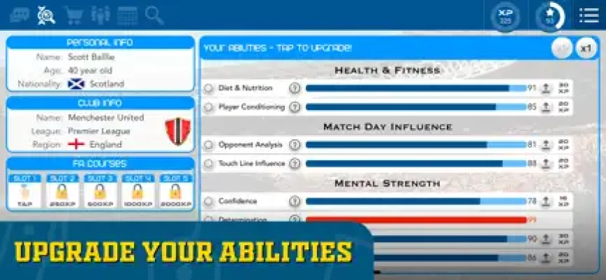 Aside from developing the club, you should develop you own character. Use experience points to upgrade your own personal abilities and become the best manager you can be. Perhaps you focus on becoming a great man-manager or specialise in a specific style of football? More importantly, as you improve, do you stay loyal to your current club or move on to pastures new? After all, that new club could have a much bigger transfer budget!