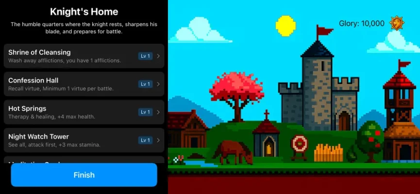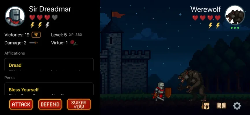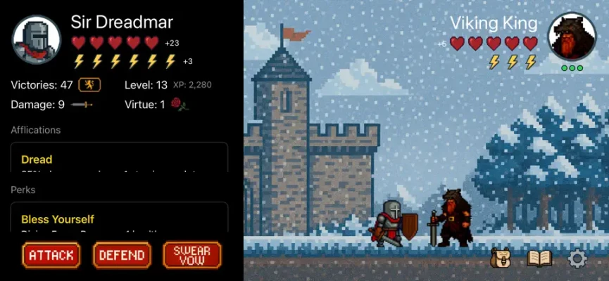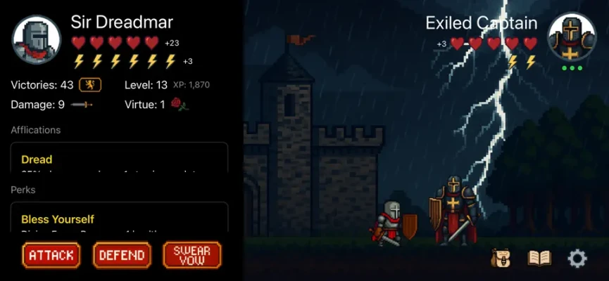 Each battle is a tactical challenge where timing and virtue determine victory. Attack deals damage unless your opponent Defends. Defend blocks attacks but falls to a Vow. Swearing Vows grants Virtue and breaks ties - but neglect your oaths and your standing will fall. EPIC JOURNEY Embark on a legendary quest through 56 battles against fearsome enemies. Face 22 powerful bosses, each with cinematic cutscenes. Unlock 43+ journal entries documenting the creatures and legends you encounter. From Savage Raiders to Ancient Dragons, every victory brings you closer to your final oath. FIVE UNIQUE MINIGAMES Break from battle with diverse challenges: Joust - Prove your skill in tournament combat Singing - Master the art of courtly ballads Feast - Navigate political intrigue at royal banquets War - Command armies in strategic warfare Oath of Lies - Uncover truth through deception CHARACTER PROGRESSION Level up through 13 ranks, unlocking 12 powerful perks that transform your combat abilities. Build your knight's home with 7 upgradeable buildings - each enhancing your strength, health, stamina, and divine favor. Earn Glory to expand your estate and unlock new powers. DIVINE BLESSINGS Accumulate Virtue through honorable actions to unlock 26 divine blessings. From healing miracles to devastating strikes, your virtue shapes your destiny. Choose wisely - some blessings require sacrifice, while others reward pure honor. RICH STORY & LORE Immerse yourself in a dark medieval fantasy world filled with cursed knights, vampire lords, demonic entities, and ancient dragons. Each enemy has a story, and your journal chronicles every encounter. Uncover the mysteries of a realm where honor is the last light against darkness. FEATURES 56 tactical battles with rock-paper-scissors combat 22 epic boss battles with cinematic cutscenes 5 unique minigames for varied gameplay 13 character levels with 12 unlockable perks 7 upgradeable buildings to customize your knight 43+ journal entries to discover 26 divine virtue actions to master Deep progression system with equipment and afflictions Auto-save system to preserve your progress Game Center leaderboards and achievements Atmospheric medieval soundtrack PROVE YOUR HONOR Every decision matters. Will you fight with honor and earn divine favor, or fall to the darkness? Your legend awaits - swear your final oath and claim your place among the greatest knights.