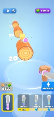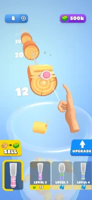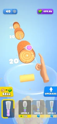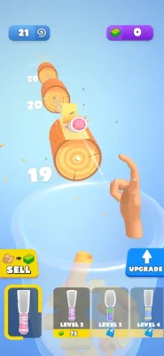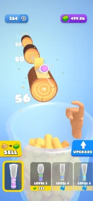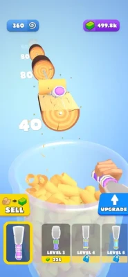 Throw your spatula to carve anything in your way. Watch all the logs in front of you get carved into pieces. Collect the spirals in the container and sell them all to become rich. Buy new spatulas, increase your power and become the master.