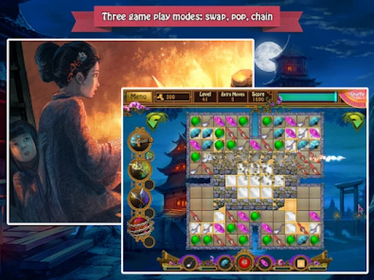 - Three gameplay modes: swap, pop, chain - Build an ancient Japanese village - Exciting adventure - Rotate the board to make the best matches - Can you win in challenge mode?