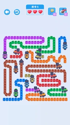 This is a puzzle game for solving puzzles. You need to guide the haphazardly parked trains away along the tracks. Each click on a train will automatically lay tracks for it to move. The train carriages have different shapes, and the trains will only depart in the direction their engines are facing. You have 3 lives, and each collision will deduct 1 life. As you progress through the levels, the number of carriages increases, and the carriages become more twisted and complex. This greatly affects your judgment. This game severely tests your on-the-spot decision-making and resource allocation abilities.