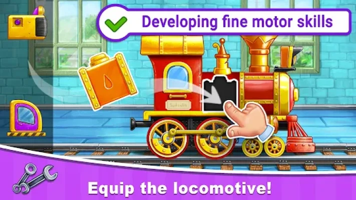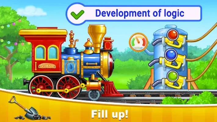 This game includes constructing a railroad and driving it to the city for future works. Kids will definitely like assembling a puzzle locomotive, car washing and fuel station with charcoal and water! Attach some wagons and drive! Next, your child will build a real passenger station, load luggage and equipment into the carriages and invite passengers to start their journey on a brand new magic train! All super entertaining and educational mechanics in one.