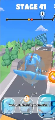 The racetrack consists of stairs, a rock wall, roads, a desert, snowy roads, a reservoir, a log bridge, etc. Pick a vehicle and drive over a road, reservoir, rock wall, cliff, etc. to win the race.