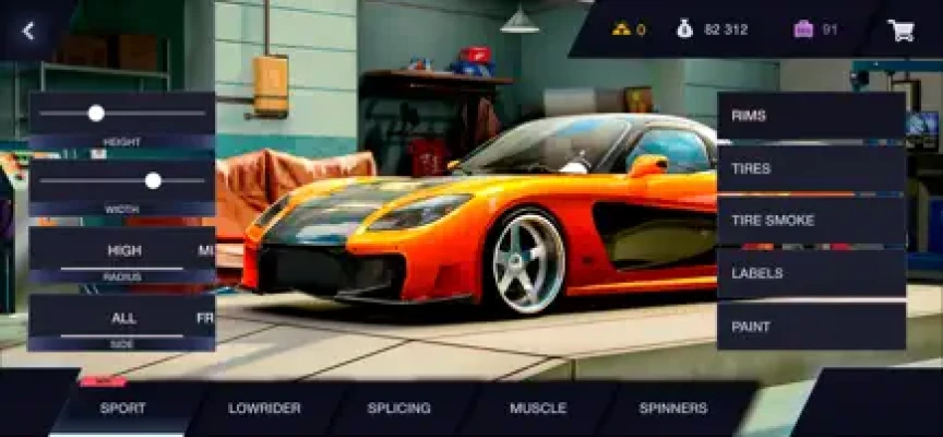 - Put bumpers, body kits, hoods, spoilers, apply vinyls or skins, choose tires and wheels;