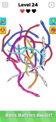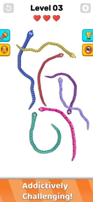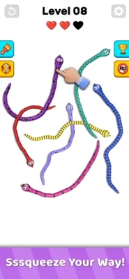 Untangle the snakes by unraveling their twisted bodies and guide them to safety. When the snakes slither away, you'll feel amazing, like a true champion!