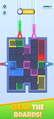 The goal is simple: Match the same colored shapes, fill them with water from the side pipes, and completely clear the board!