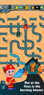 * Firefighter mode: Act as a heroic plumber and make a path with pipes to a burning house to extinguish the fire.
