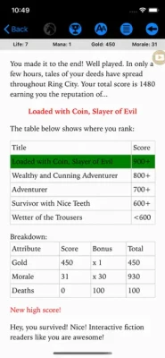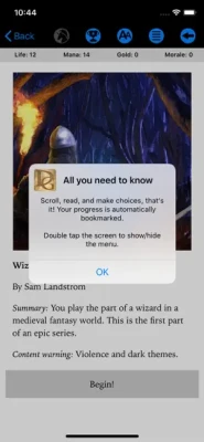 You play a wizard in this interactive novel set in a medieval fantasy world. Stay alive, manage your spell power, find treasure, and smite evil. Wizard's Choice is a series of RPG interactive novels that will engross you in a story while allowing you to make the decisions that will determine your fate.