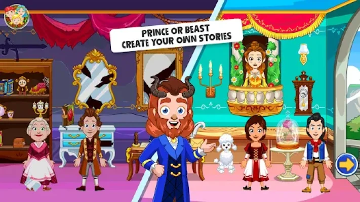 Your kids will be able to role-play their favorite fairy tale stories and create their own scenarios! You can interact with the environment and move items and characters between them in this Wonderland kids game! Play and discover a ballroom dance floor, have dinner with the Prince and Princess and their friends, play dress-up games, with your favorite clothes - all is possible in the Wonderland Beauty and the Beast game for kids!