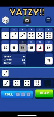 After each roll, all valid scores are highlighted in yellow so you can quickly decide where to apply the results. Where you place the score from each roll is up to you. There are thirteen turns of 3 rolls each per game. After each roll you can choose which dice to keep by touching them, then the remainder will be included in the next roll. At the end of the 3 rolls, you must assign the score before you can move on to the next turn. The first Yatzy is worth 50 points and each subsequent Yatzy will be rewarded with a 100 point bonus. If you score 63 or greater on the left side of the score card, you will get a 35 point bonus.